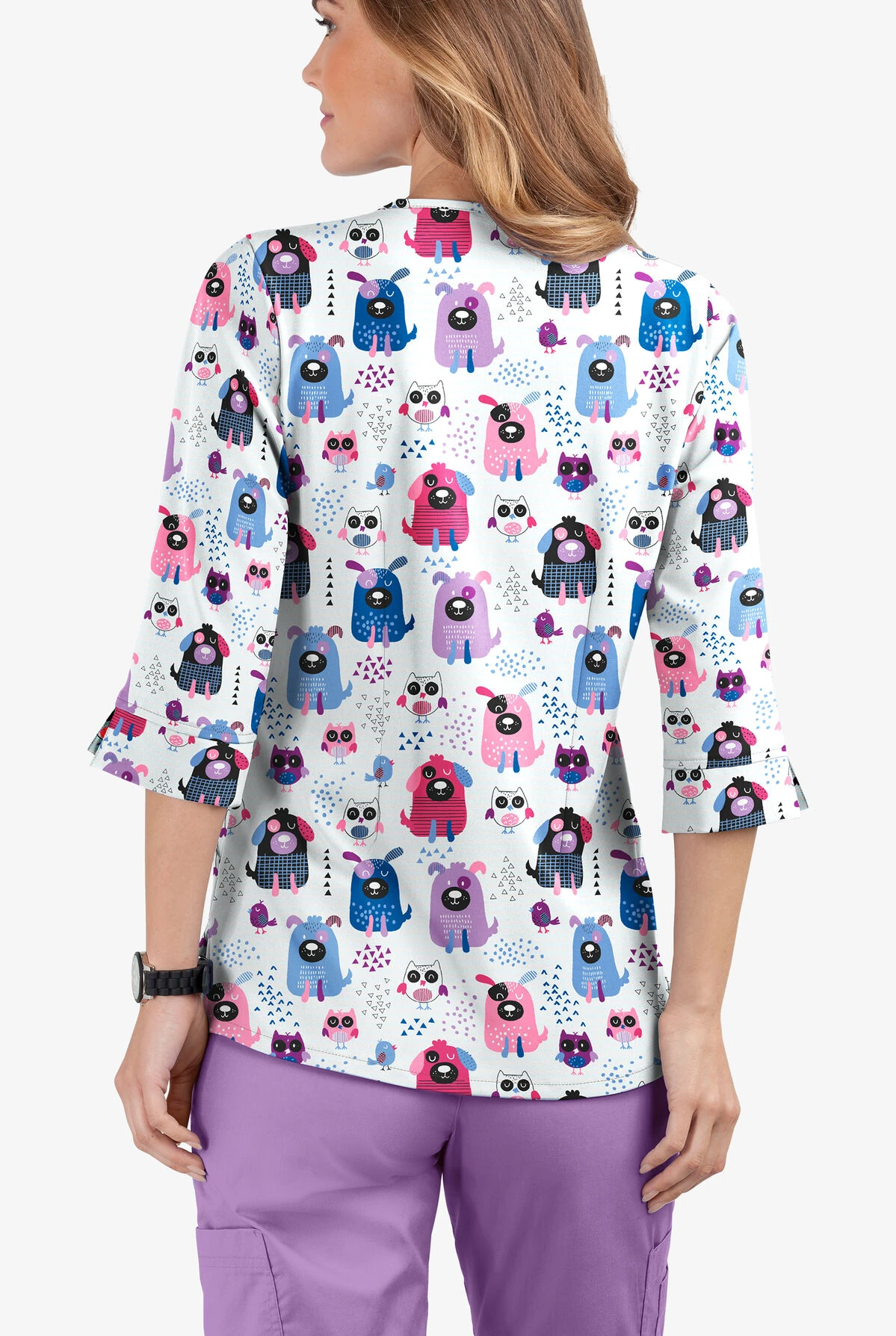 The Butter-Soft Yard Friends White Printed Women’s 4-Pocket 3/4 Sleeve Scrub Top features a round neckline with 3-button closure. Front and back darts give this fashion scrub top shape, while the 3/4 length sleeves with slits provide additional comfort. For storage, you’ll find 2 double front pockets. Side slits have been added to the hem for ease of mobility. Made of 97/3 Poly/Spandex.