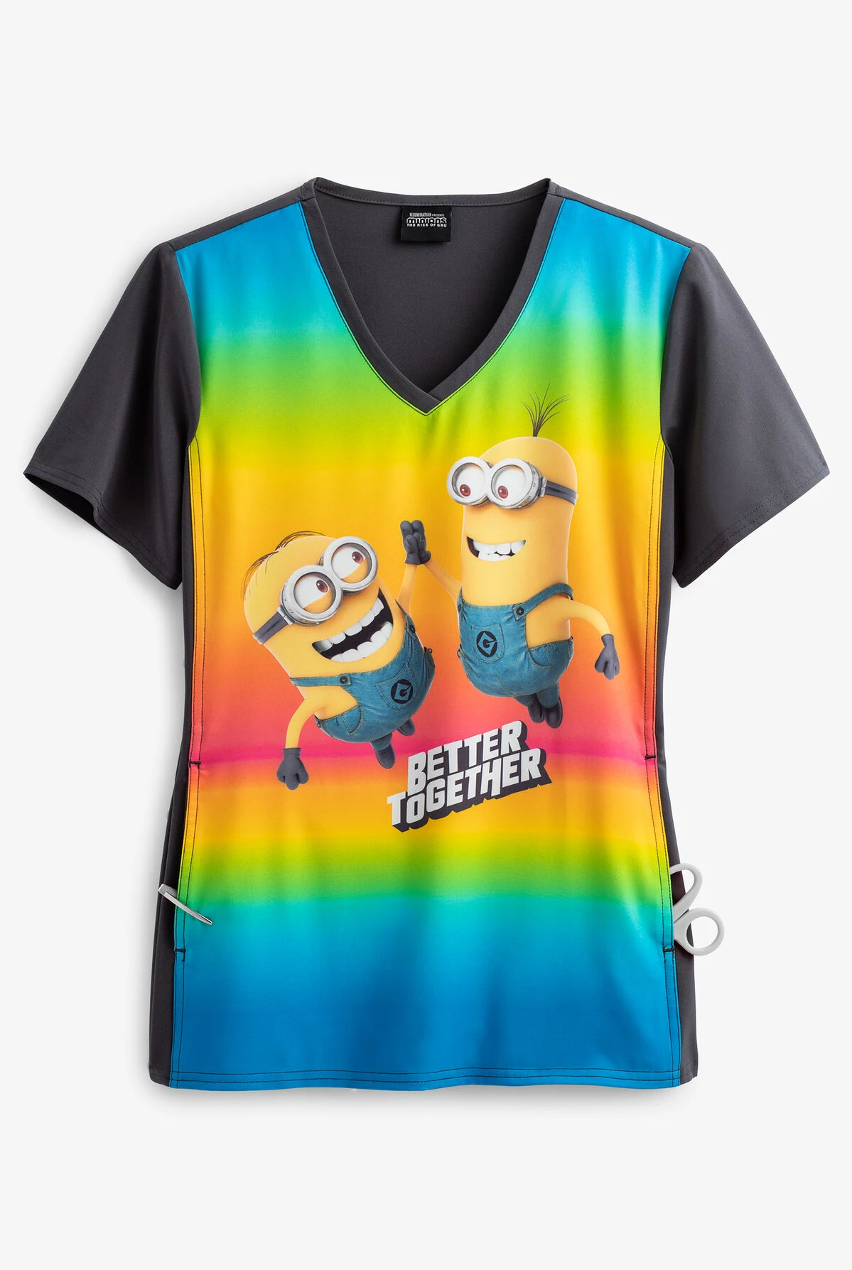 The Cherokee Tooniforms Tf627-dpnv Illumination Friends Together V-neck Print Scrub Top Features The Minions Bob And Kevin From The Illumination Movie The Rise Of Gru. Top Has A Modern Classic Fit, Contrast Banded V-neckline Front Print Panel, Contrast Side And Back Panels, Front And Back Princess Seams, Back Vents And 1 Front Kangaroo Pocket. Fabric Content Is 95/5 Poly Poplin/spandex.