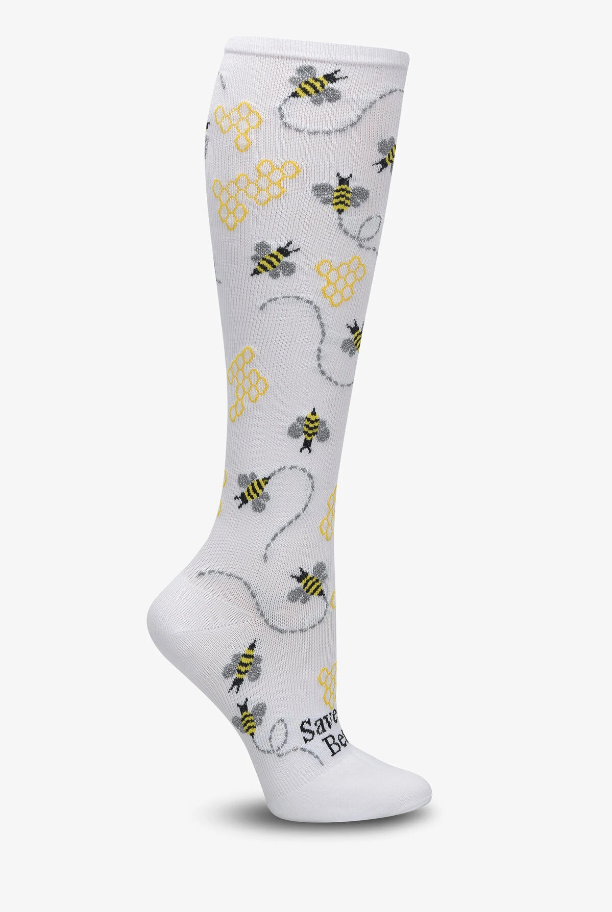 Treat your feet and legs to a little support. The light, gradient compression of Nurse Mates NA0022799W Save the Bees Wide Calf 12-14 mmHg Compression Socks is designed to help energize and soothe. Support is greatest at the ankle, lessens gradually to the non-binding top band. A percentage of the profits is donated to the World Wildlife Fund.