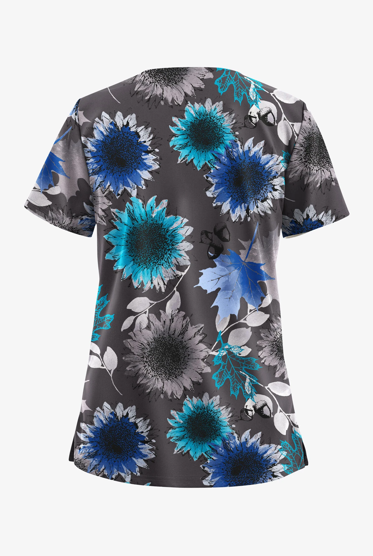 - Features sunflowers in blue, turquoise and gray on a darker gray background