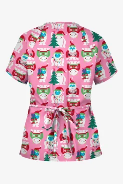 Butter-Soft Happy Monsters Pink Women’s 2-Pocket Mock Wrap Print Scrub Top