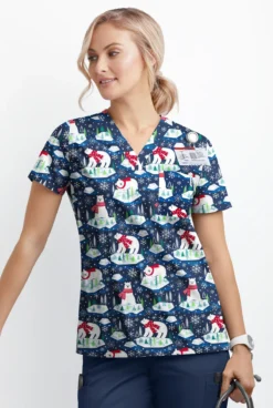 Butter-Soft Santa On Vacation Pewter Women’s 1-Pocket V-Neck Tuck-In Print Scrub Top