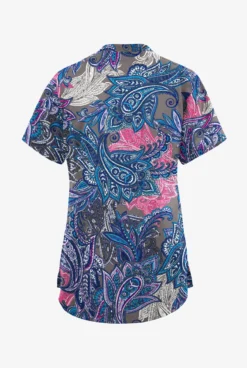 Butter-Soft Originals Layered Paisley Grey Stone Women’s 6-Pocket Mandarin Collar Printed Scrub Top