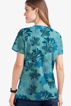 UA Butter-Soft STRETCH Garden Lilies Aqua Moon Women’s 4-Pocket Criss Cross Print Scrub Top